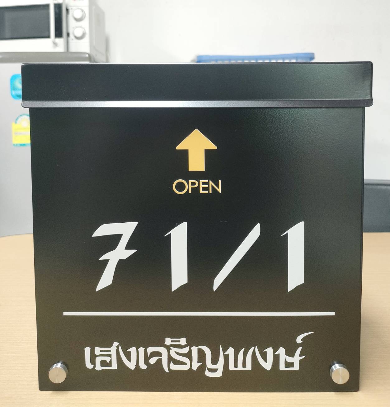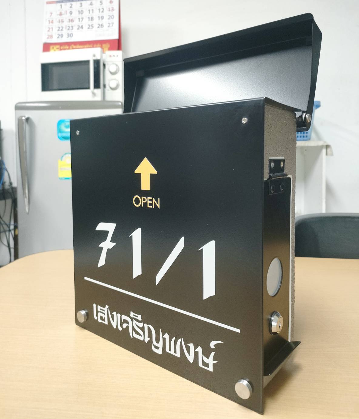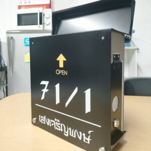 ➡️ ใส่จดหมายด้านบน, เปิดรับจดหมายด้านข้าง, ด้านข้างมีกระจกเพื่อให้มองเห็นด้านใน